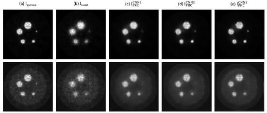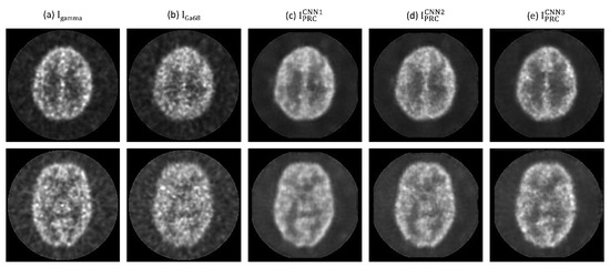 Figure 3 demonstrates Igamma, IGa68, and Ga-68 PET images after positron range correction based on CNN1 (), CNN2 () and CNN3 () of PHANbrain. With naked eye observation, boundaries in Ga-68 PET images became sharper after correction. Figure 4 demonstrates Igamma, IGa68, , , of PHAN5rod with TBR = 0 and 10. The 2-mm rod in PHAN5rod with TBR = 0 that was barely seen in IGa68 became visible in and . The RMSE and PSNR between Igamma and IPRC are shown in Figure 5a for PHANbrain and Figure 5b for PHAN5rod with TBR = 10. Lower RMSEs and higher PSNRs were observed in Figure 5b than those in Figure 5a. For either phantom configuration, the lowest RMSE and the highest PSNR were found in CNN3-based correction, followed by CNN2- and CNN1-based correction.