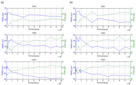 RMSE (solid line, left axis) and PSNR (dashed line, right axis) between Igamma and IPRC for (a) PHANbrain and (b) PHAN5rod with TBR = 10 (top row: CNN1-based correction; mid row: CNN2-based correction; bottom row: CNN3-based correction).