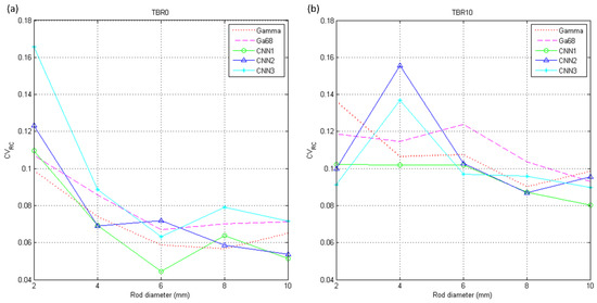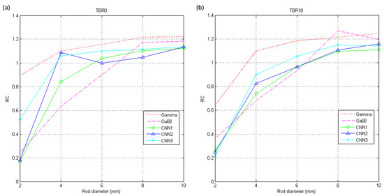The RCs of Igamma, IGa68, , , are shown in Figure 6a for PHAN5rod with TBR = 0 and Figure 6b for PHAN5rod with TBR = 10. The RCs of positron range corrected images were higher in TBR = 0 than those in TBR = 10 for 4- and 6-mm rods, while the difference was less obvious in 8- and 10-mm rods. Among three corrected images, the highest RCs were observed in for 6-, 8-, and 10-mm rods in TBR = 0, while the highest RC for 4-mm rod was observed in . With regard to TBR = 10, the highest RCs were observed in for 4-, 6-, and 8-mm rods, while the highest RC for 10-mm rod was observed in . The CVRCs of Igamma, IGa68, , , were shown in Figure 7a for PHAN5rod with TBR = 0 and Figure 7b for PHAN5rod with TBR = 10. The CVRCs of positron range corrected images were lower in TBR = 0 than those in TBR = 10 for 4-, 6-, 8-, and 10-mm rods. Among three corrected images, the CVRCs of were slight lower than those from and for either phantom configuration.