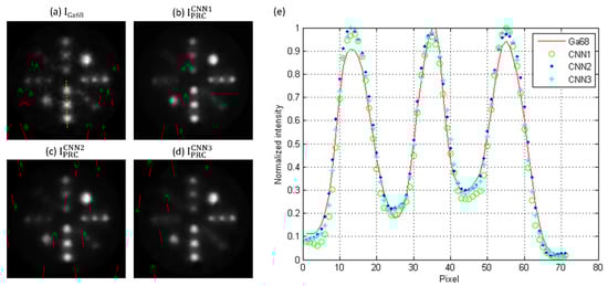 In Reference [22], it was assumed that the reconstruction method already incorporated positron range correction for F-18, and their image data for CNN training, testing, and validation were generated from numerical models of mice from a repository. In this work, the CNN output images were back-to-back 511-keV gamma rays, which were not affected by the positron range effects. Hence, our method can be used in PET scanners without F-18 positron range correction. NEMA performance measurements have been well accepted by the manufacturers, and most major companies now specify their product performance in terms of these standardized and traceable specifications. This approach to performance documentation facilitates quantitative comparison of cameras by the user with the assurance that all reported values are measured in the same way and, therefore, are directly comparable [26,27]. Hence, a modified NEMA protocol was used in this study to evaluate the performance of CNN-based positron range correction in terms of resolution recovery and spill-over. Our results demonstrated that the image quality of Ga-68 images was improved after positron range correction based on the 3 CNN models investigated in this work, while CNN3 outperformed CNN1 and CNN2 qualitatively and quantitatively. With regard to qualitative observation, it was found that boundaries in Ga-68 images became sharper after correction (see Figure 3, Figure 4 and Figure 8). As for quantitative analysis, the RC and SOR were increased after correction, while no substantial increase in CVRC or CVSOR was observed. Overall, CNN3 should be a good candidate architecture for positron range correction in Ga-68 preclinical PET imaging.