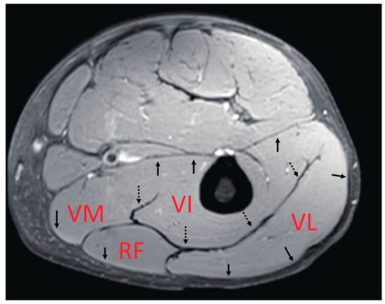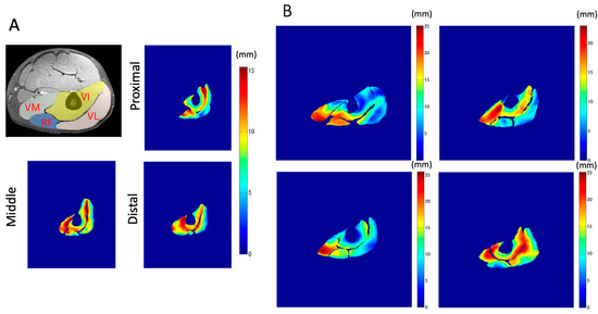The data are reported as mean ± SD. Statistical analyses were performed using IBM SPSS Statistics 22 (IBM, Endicott, NY, USA). Repeated-measures of ANOVA were used to detect significant displacement effects. This analysis was performed between the muscles in each portion (e.g., VL vs. RF vs. VI vs.VM in the proximal portion) and between the positions of one muscle (e.g., proximal vs. middle vs. distal in VL muscle). If the F-statistic of the ANOVA was significant, differences between means were assessed using Tukey’s HSD post-hoc test. In the proximal portion, as the muscle belly of the VM was not visible in the imaging plane, a comparison only between VL, RF, and VI was performed. The level of statistical significance was set at p < 0.05.