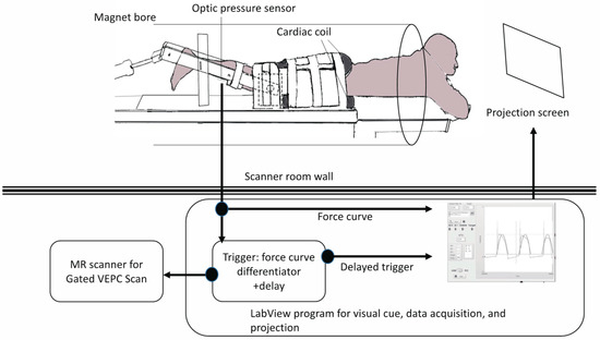 Figure 2). The subject lay prone and leg first in a 1.5T MRI scanner (Signa HDx, GE Medical Systems, Chicago, IL, USA), with the thigh horizontal inside the anterior and posterior parts of an eight-channel cardiac coil. To ensure that the thighs did not move upward during the downward exertion of the tibia (see below), the thighs were stabilized by Velcro restrainers over the gluteal muscles, cardiac coils, and at the knee. The tibia rested at a pre-determined angle (35° knee flexion) on a firmly anchored carbon fiber plate, which had an optical force transducer super-glued on the opposite side. It could measure the amount of force exerted by the subject through the tibia. The output of the force transducer was converted to an analog signal using a spectrophotometer (Fiber Scan, Luna Innovations, Roanoke, VA, USA), digitized using an analog-to-digital converter (ADC), and then inputted to a computer and used for various purposes, including being recorded for subsequent analysis. An indigenous algorithm developed for this study using LabView (National Instruments, Austin, TX, USA) and MATLAB (The MathWorks, Natick, MA, USA) synchronized the time period of the contractions to 3 s in these experiments. The subject was trained to follow a visual target guide generated by the same algorithm on the computer and projected onto a screen at the base of the patient gurney table (the patient could view this while being scanned) while exerting isometric contractions. The accuracy and consistency of the force exerted over different cycles were enhanced by a biofeedback system in which the force exerted, sensed by the force transducer, was projected back through the same computer algorithm as an overlay on the target visual guide. The subject was instructed to follow the guide and correct the timing and magnitude of force. The indigenous algorithm also differentiated the force output to generate a trigger output that was used to trigger the gated scan on the MRI scanner. Before the start of the MRI scans, three trials of the subjects exerting maximum voluntary contractions (MVC) were recorded. The target level of the force was then adjusted to a percentage of the MVC value for the subject to exert during subsequent MR acquisition. The force level was 40% of MVC.