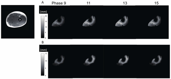 Subsequently, the displacement of each voxel of the muscle tissue was tracked on a frame-by-frame basis throughout the contraction–relaxation cycle for each muscle in all planes. For this purpose, the images reflecting the velocity in the X- (medial–lateral) and Y-directions (anterior–posterior) in the VEPC images were evaluated to track the in-plane displacement of each volume element. Accounting for the third velocity component (proximal–distal), the magnitude of the total displacement with respect to the original position in the first frame was then calculated as the square root of the sum of squared displacements in each direction (DISP =