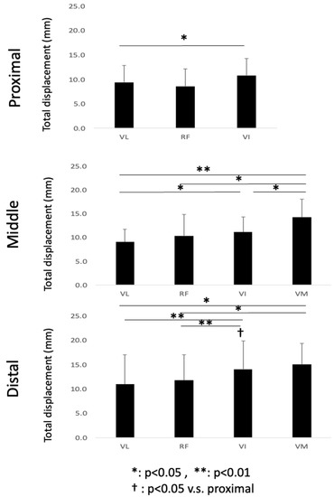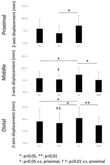 From the results of the comparison of the mean values of displacements, the heterogeneity in displacement among the four synergist muscles was observed in both the total and Z-axis displacements. It should be noted that the main role of the muscle–tendon complex in generating physical movements is to generate not only the tension force along the direction of the line of action, but also mechanical work. Since the mechanical work is determined as the product of force and displacement, it is important to experimentally measure the displacement of the muscle tissues along the Z-axis, corresponding approximately to the line of action. Thus, the 57% larger Z-axis displacement of VI suggests that its contribution to mechanical work is higher than that of the other muscles in the quadriceps. This, in turn, suggests that the VI is the main generator of force and mechanical work, at least in terms of displacement among the four muscles. Furthermore, a tendency of larger displacements in the distal compared to the proximal regions was observed in VI (83% higher). Other muscles showed similar behavior with larger displacement in the distal compared to the proximal, although such differences were not statistically significant (e.g., p = 0.07 for both proximal and distal regions for VM and VL). This result showed that, even in one muscle belly, the proximal tissue was not deformed significantly, whereas the distal tissue was extensively deformed. This might have resulted from the high contribution of the distal component to force and work (displacement) generation along the muscle belly.