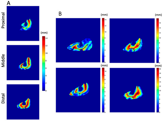 To evaluate the dominant direction of tissue displacement between the proximal and distal, medial–lateral, or anterior–posterior directions, the ratio of the Z-component displacement to the total displacement was calculated for all voxels and ranged from −1 to 1. If this ratio was near 1 or −1, it meant that the displacement along the proximal–distal (Z) direction was dominant among the three directions.