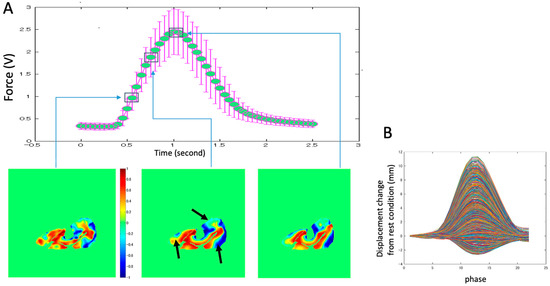 Figure 9A) also indicates that the complex displacement of tissue changes three-dimensionally, with a combination of in-plane and out-of-plane displacements during contraction. An example of the displacement changes with time in all pixels of the middle section image (