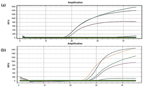 Amplification curves obtained by RT-PCR with the MOLgen SARS-CoV-2 Real Time RT-PCR Kit: (a) amplification curves of a sample negative for E gene amplification; (b) amplification curves of a sample positive for E gene amplification (orange line).