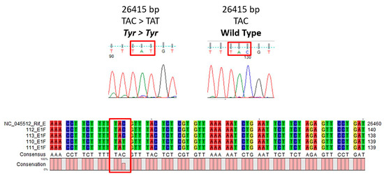 Of the six samples from the CDI, four did not amplify for the E gene in RT-qPCR (Figure 1), whereas two were used as positive controls as they did amplify for the E gene. In any case, all samples tested positive for SARS-CoV-2. The outcomes of the sequencing in our laboratory reveal that all the samples that did not amplify in RT-qPCR harbor a synonymous mutation at the E gene level, namely in position c.2641 C > T (Reference Genome: NC_045512, TAC > TAT, Tyr > Tyr, Figure 2).