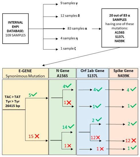Of the 75 samples belonging to lineage B.1.1.7, 20 showed at least one out of these three mutations: S137L (Open Reading Frame 1ab gene), N439K (Spike gene), and A156S (Nucleocapsid Gene). Of these, 5 harbored the synonymous mutation in the E gene at position 26415 bp, TAC > TAT, while the remaining 15 did not.