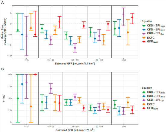 Figure 1. Performance of the eGFR-estimating equations. (A) Median bias ± 95% confidence intervals (CI) according to different ranges of eGFR (mL/min/1.73 m2 of body-surface area) for the GFRNMR, CKD-EPI2009, CKD-EPI2012, CKD-EPICys and EKFC equations. (B) Accuracy (1-P20 ± 95% CI) according to different ranges of estimated GFR (mL/min/1.73 m2 of body-surface area) for the GFRNMR, CKD-EPI2009, CKD-EPI2012, CKD-EPICys and EKFC equations. 1-P20 is the percentage of eGFR values lying outside the tolerance range of 20% of measured GFR. In (A,B), the range of n values per eGFR subgroup are as follows: 3 to 6 for eGFR < 15 mL/min/1.73 m2, 30 to 68 for 15–29 mL/min/1.73 m2, 213 to 271 for 30–59 mL/min/1.73 m2, 159 to 237 for 60–89 mL/min/1.73 m2, and 77 to 117 for ≥90 mL/min/1.73 m2.
