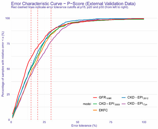 Figure 2. Regression Error Characteristic Curve for all error tolerance Px values for GFRNMR, CKD-EPI2009, EKFC, CKD-EPICys, CKD-EPI2012. Px denotes the percentage of eGFR values within x% of measured GFR. The red dashed lines indicate error tolerance cutoffs of (from left to right) P15, P20 and P30, respectively. The y-axis shows the corresponding percentage of samples within the given error tolerance Px value on the x-axis. Colored curves represent the results of the different equations.