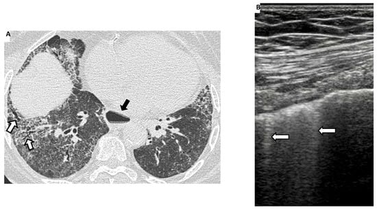 To the left (A), an HRCT scan of a patient with systemic sclerosis showing extensive ground-glass opacities and reticulations with traction bronchiectasis (white arrows) in the basal regions of both lungs. The findings are compatible with a fibrotic NSIP pattern. Note also, in this case, a dilated esophagus (black arrow). To the right (B), ultrasonographic scans (4–13 MHz broadband linear transducer) with the presence of 2 ultrasound B-line (white arrows) in the same patients.