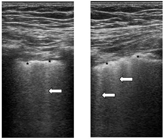 Ultrasonographic scans (4–13 MHz broadband linear transducer). Ultrasound B-lines (or comet-tails) are defined as hyperechogenic artefact consistent with thickened subpleural interlobular septa (white arrows). They originate from the pleural line and are roughly perpendicular to it. They have a narrow base and form a ray that spreads away from the pleural line towards the bottom of the screen and move synchronously with the lung respiration. The pathological pleural line shows irregularities (★).