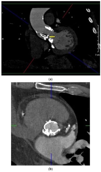 - Suchá, D.; Chamuleau, S.A.J.; Symersky, P.; Meijs, M.F.L.; Brink, R.B.A.V.D.; De Mol, B.A.J.M.; Mali, W.P.T.M.; Habets, J.; Van Herwerden, L.A.; Budde, R.P.J. Baseline MDCT findings after prosthetic heart valve implantation provide important complementary information to echocardiography for follow-up purposes. Eur. Radiol. 2015, 26, 997–1006. [Google Scholar] [CrossRef] [PubMed] [Green Version]