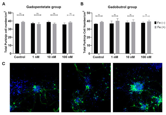 Total Purkinje cell number of the (A) gadopentetate group and (B) gadobutrol group. There were no differences in cell number among all treated groups when compared to the control group. (C) Representative images of the cells at low magnification (10×). ns: not significant.