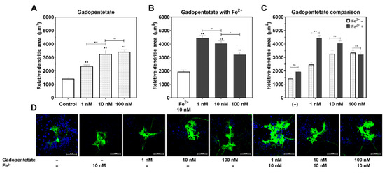 Changes in the relative dendritic area of the Purkinje cells post incubation with gadopentetate with/without Fe2+. (A) Gadopentetate significantly increased Purkinje cells’ dendrite arborization compared to the control group, particularly at 100 nM. (B) Fe2+ attenuated the effect of gadopentetate on the dendrite arborization. (C) The relative dendritic area of Fe2+ + gadopentetate-treated cells was significantly higher than for gadopentetate-treated cells. (D) Representative photomicrograph of gadopentetate-treated Purkinje cells. ** p < 0.01 and * p < 0.05 indicate a statistical significance by Tukey’s HSD post-hoc test compared to the control, unless indicated with a significance bar. ns: not significant.