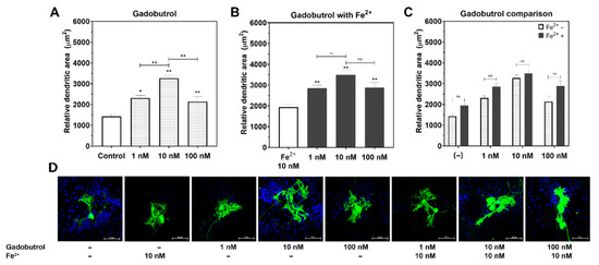 There was a significant interaction between gadopentetate and Fe2+ (p < 0.01, η2 = 12.18, ANOVA). The incubation of 10 nM Fe with 1 nM gadopentetate significantly increased dendrite arborization, but not with 10 nM gadopentetate (p = 0.06) or 100 nM gadopentetate (p = 0.97; Figure 2C). In contrast, there was no interaction between gadobutrol and Fe2+ (p = 0.56, η2 = 1.21, ANOVA). The incubation of 10 nM Fe2+ did not increase dendrite arborization at any gadobutrol concentration (Figure 3C).