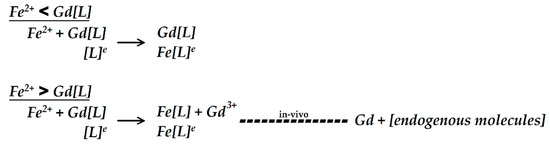Proposed mechanism of how the concentration ratio between Fe2+ and chelated gadolinium (Gd[L]) contributes to transmetalation. When the Fe2+ concentration is lower than Gd[L] with excess ligand [L]e, Fe2+ will bind primarily with the [L]e before competing with Gd[L]. However, when the Fe2+ concentration is higher than Gd[L], the [L]e may not be sufficient for Fe2+ binding. Consequently, Fe2+ will compete with Gd[L], resulting in Gd3+ being released from its chelate (transmetalation). When transmetalation occurs in vivo, Gd3+ may bind with endogenous molecules such as phosphate or carbonate or may form a macromolecule complex.