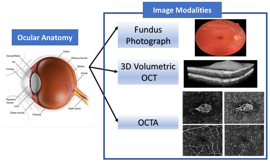 The eye anatomy is depicted in Figure 2. There are several visible elements of the eye, including the sclera, the cornea, the iris, and the pupil. After moving through the anterior chamber and cornea, the ray of light is scattered by the pupil and lens before finally falling on the retina. The different parts of the eye can be captured by various medical imaging devices. The acquired images are utilized to visualize different pathological findings. There are a number of technologies used to acquire these images. Figure 3 also shows the different image modalities used in diagnosing AMD.