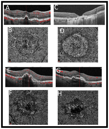 - Ma, J.; Desai, R.; Nesper, P.; Gill, M.; Fawzi, A.; Skondra, D. Optical coherence tomographic angiography imaging in age-related macular degeneration. Ophthalmol. Eye Dis. 2017, 9, 1179172116686075. [Google Scholar] [CrossRef]