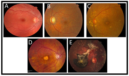 The fundus photograph is a visual record that records the appearance of the patient’s retina with an ophthalmoscope. Fundus photography is often required in various eye diseases. Color photography of the fundus has been utilized in the staging and classification of AMD [36]. In early stages of AMD, fundus photography can reveal drusen, which are usually found incidentally during ophthalmoscopy of an asymptomatic individual. Drusen material, which accumulates between RPE and Bruch’s membrane, appears in color fundus photographs as bright white or yellow spots. There are two types: soft spots and hard spots. Hard drusen are characterized by their small size, inconspicuousness, and well-defined, round edges, while soft drusen are less clear and often converge. As drusen commonly occur during normal aging, their presence by itself does not indicate AMD, but as their number and size increase, it increases the risk of AMD with visual symptoms. As AMD progresses, many other signs can be detected, such as pigmentary changes in the RPE that foretell geographic atrophy or exudative abnormalities that indicate conversion to wet AMD [37]. The drusen can be distinguished by the human eye due to their heterogeneous composition that appears as yellowness and brightness in the fundus photographs. However, the recent development of computer algorithms that automatically detect drusen are helpful in differentiating it form other similar pathological appearance, such as hard exudates. Figure 4 shows examples of retinal fundus image for different grades of AMD against normal retina.