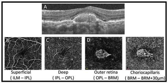 An illustrative OCTA image of a CNV lesion using Optovue Angiovue. We can see the superficial and deep retinal plexuses (B and C, respectively), as well as the outer retina (D) and the choriocapillaries (E). An extensive CNV, composed of loops and peripheral anastomoses, is encompassed by a hypointense halo. Subretinal fluid can be seen on SD-OCT (A).