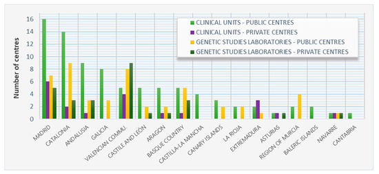 In contrast with the lack of specific Genetic Counselling Services for RD in Spain, highly specialized multidisciplinary units and/or centres (CSUR, Reference Centres, Services and Units) for particular diseases (some of them of low prevalence) are being created since 2008. Currently, there are 71 specific disease groups that are covered by up to 297 CSUR in the country. However, one of the main objectives of these units is not necessarily medical assistance but to become a reference contact for disease management strategies definition as well as support for both, patients and clinicians dealing with a particular disease [50]. In fact, these centres or units belong to public hospitals that agglutinate a series of clinical specialists who are experts in specific disease groups (but they are not a genetic service itself). Clinicians join creating multidisciplinary groups to serve as reference centres for the whole country, but as genetic counsellors are not usually incorporated in these groups, patients lack this service. Clinicians in these CSUR might be specialized in specific methodologies and are able to define therapeutic strategies or function as consultants for the general practitioner of the patients with these pathologies but do not necessarily deal with the patient directly offering genetic counselling. Regarding these CSUR, there are three main regions in Spain accumulating most of these centres: Catalonia (97/297), Madrid (89/297) and Andalusia (39/297) (Figure 2), implying that most patients need to move from their region to a different one to receive specialized disease management. Despite being specialized in some genetic diseases, this CSUR does not provide Genetic Counselling as a service, neither do other centres offering genetic testing to their patients.