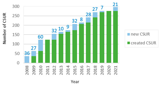 Number of Reference Centres, Services and Units (CSUR) along the time. Source: Listado CSUR, 2021.