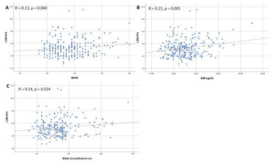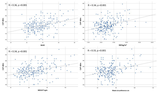 3.3. Correlation between Anthropometric Parameters, CAP and LSM