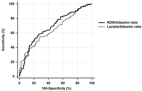 The comparison of the AUROCs. (RDW/Albumin ratio, 0.694 and lactate/albumin ratio, 0.664, p = 0.455).