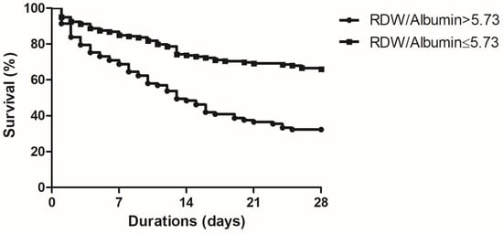 Continuous data were presented as the median with interquartile range (IQR) and the Mann–Whitney U test was used for comparison. Non-continuous data were reported as numbers (%) and were compared using Fisher’s exact test and/or the chi-square test. By using a receiver-operating characteristic (ROC) curve and the Youden method, a cut-off value was determined to classify low and high RDW/albumin ratios []. Factors associated with 28-day mortality were determined using multiple logistic regression analysis. Factors with significance in univariate analysis were entered in a multivariate analysis using backward stepwise methods. The Kaplan–Meier method and the log-rank test were used to compare the 28-day mortality between low and high RDW/albumin ratio groups. A p-value less than 0.05 was considered statistically significant. All analysis of data were performed using SPSS software version 22.0 (IBM Corp., Armonk, NY, USA) and MedCalc® for Windows, Version 15.22.4 (MedCalc® Software, Ostend, Belgium) and figures were generated using Prism 5.01 (GraphPad Software Inc., San Diego, CA, USA).