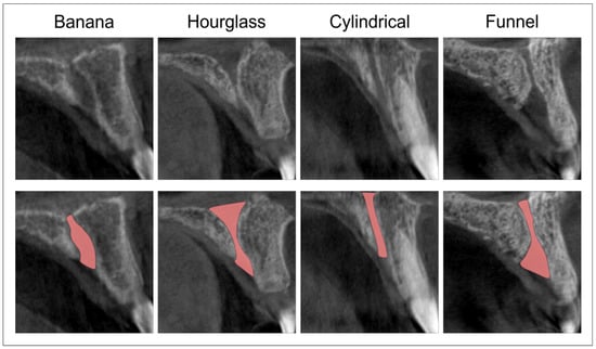 Furthermore, we estimated the impact of NPC type on predefined NPC diameters (A-P NF, M-L IF, A-P IF, and NPC length). The analysis revealed that funnel NPC type was not only accompanied with significantly lower AP-NF diameter when compared to the hourglass and cylindrical type but also with a significant increase in A-P IF diameter when compared to the cylindrical shape. At the same time, significant reduction in M-L IF diameter was observed in cylindrical NPC type, while this parameter was the most prominent in banana NPC type, which is in line with previously presented observations [41]. As previously reported [41], those morphometric parameters could be of clinical relevance for the interventions in the anterior maxilla, such as implant placement. However, morphometric analyses, such as those performed in this study, could also influence other clinical aspects, since it has been shown that the increase in NPC width (M-L IF) was accompanied by higher prevalence of NPC perforation during maximum central incisors retraction [20,22]. Furthermore, the enhancement of ML-IF diameter can also be addressed for subsequent complications, such as orthodontically induced inflammatory root resorption [12,27,50]. Accordingly, since the results of this study clearly demonstrated that M-L IF dimension was influenced by NPC type and was significantly enhanced in banana NPC type, it seems that the patients with this NPC type may represent the group with a higher risk for complications during maximum central incisors retraction.