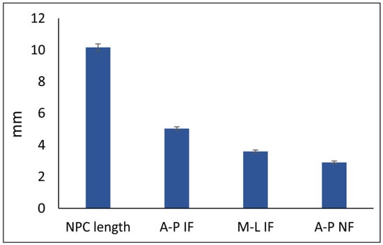 The evaluation of the impact of NPC type on NPC diameters at different sections (Figure 4) revealed a significant influence of NPC shape on A-P NF, A-P IF, and M-L IF (df = 3, F = 6.122, 3.512, and 3.952, respectively), with no significance for NPC length (F = 1.508). Antero-posterior diameter of the nasal foramen (Figure 4A) was significantly lower in funnel NPC type when compared to the hourglass (p < 0.05) and cylindrical (p < 0.01) NPC types. Medio-lateral diameter of the incisive foramen (Figure 4B) was significantly extended in the banana type when compared to the cylindrical NPC type (p < 0.05). In contrast, the A-P diameter of an incisive foramen in funnel NPC type (Figure 4C) was significantly above the values observed in the cylindrical type (p < 0.05).