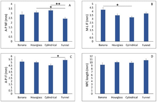 The impact of NPC type on NPC diameters at different sections. (A) A-P diameter of NF, (B) M-L diameter of IF, (C) A-P diameter of IF, and (D) NPC length. Bars represent the mean ± SEM. * denotes a significant difference of p < 0.05; ** denotes a significant difference of p < 0.01.