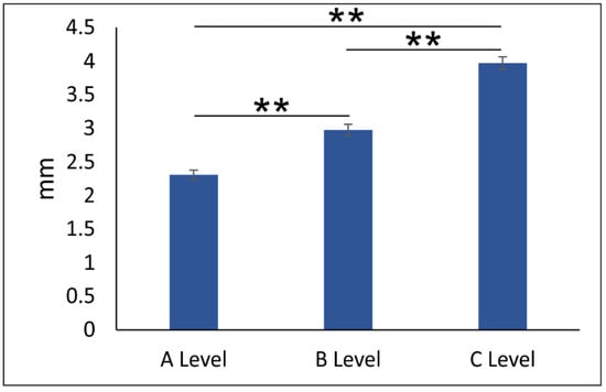 The distance between NPC and central incisors at different levels of anterior maxilla. Bars represent the mean ± SEM. ** denotes a significant difference of p < 0.01.