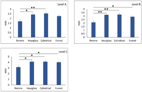 As presented in Figure 5, the distance between NPC and central incisors at different levels of anterior maxilla showed a stepwise increase with significant differences among the levels (df = 2, F = 101.582, p < 0.01). However, the impact of NPC on the distance between central incisors and NPC at different sections of the anterior maxilla (Figure 6) was also significant for all three estimated levels—A, B, and C (df = 3, F = 4.502, 5.815, and 3.610, respectively). The impact of NPC shape on the distance between NPC and central incisors at level A was manifested by a significant reduction in distance in banana type when compared to the hourglass (p < 0.05) and cylindrical (p < 0.01) NPC types (Figure 6A). Furthermore, the distance to central incisors at level B for banana-shaped NPC was significantly reduced (Figure 6B) when compared to an hourglass and cylindrical type (p < 0.01) but also to funnel NPC type (p < 0.05). Almost the same reduction in NPC distance to the central incisors was observed in banana type when compared to other NPC shapes (Figure 6C, p < 0.05).