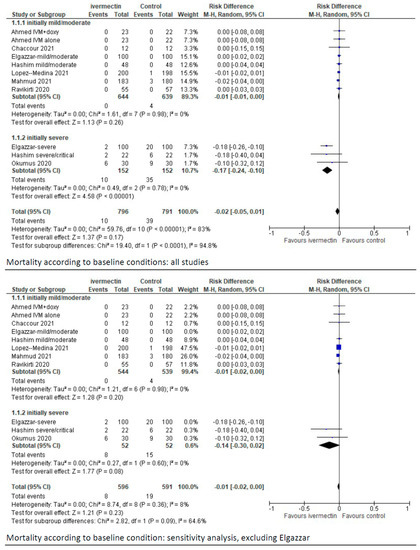 Forest plot of the comparison. Outcome: mortality according to baseline conditions. Top: all studies; bottom: sensitivity analysis excluding Elgazzar et al. [2].