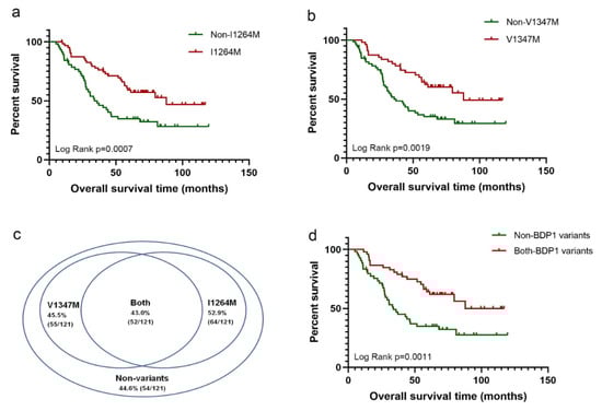 Table 1 suggests that I1264M alone has a dynamic prognostic value. Moreover, the median O.S. of the subset with non-BDP1 variants was 33.8 months, much shorter than the median O.S. of the subset harboring both BDP1 variants (87.9 months, p = 0.0011).
