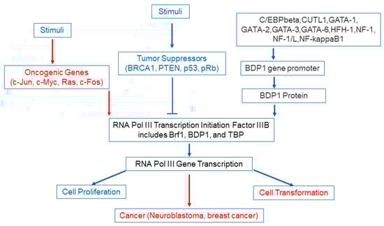 Role of BDP1 in the TFIIIB complex of transcription machinery in cell proliferation, cell transformation, and cancer progression. TFIIIB is a complex of the transcription machinery of RNA Pol III gene transcription []. TFIIIB consists of Brf1, BDP1, and TBP. Oncogenic proteins, such as c-Jun, c-Myc, Ras, and c-Fos activate TFIIIB to enhance RNA Pol III gene transcription, resulting in cancer tumorigenesis, while tumor suppressors, such as BRCA1 [], PTEN, p53, and pRb, inactivate its activity to decrease the transcription of Pol III genes [], leading to repression of tumor development [BDP1, a.k.a., TATA Box Binding Protein (TBP)-Associated Factor] []. TFIIIB). The concept of BDP1’s cancer-involved is emerging with colorectal cancers [,], lung cancer [], and breast cancer [].