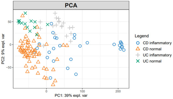 To investigate mucosal pathophysiology in IBD, we first performed an unsupervised PCA analysis of the RNA-seq data (Figure 1). PCA indicates sample similarity/differences based on all the data included. The PCA of the log-transformed expression values revealed the distinct clustering of samples by the presence of inflammation and disease type. The first component (39%) mostly separated the inflammatory samples from the normal samples, and the second component (9%) roughly distinguished CD from UC.