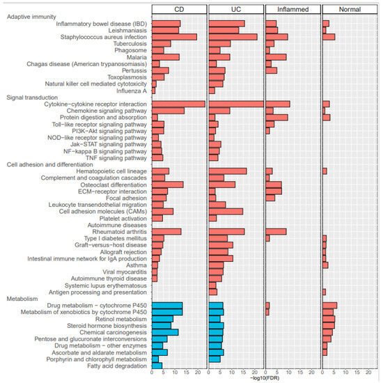 KEGG pathways enriched in the lists of differentially expressed genes (DEGs). The four panels correspond to the DEGs of inflammatory CD vs. normal CD (labeled “CD”), inflammatory UC vs. normal UC (labeled “UC”), inflammatory CD vs. inflammatory UC (labeled “Inflamed”), and normal CD vs. normal UC (labeled “Normal”). The horizontal bars represent the -log10(FDR) values from the pathway enrichment analysis calculated with DAVID web service (red for upregulated DEGs, and blue for downregulated DEGs). Note that the lists are shown for FDR < 0.05. There were no significantly enriched pathways for the downregulated genes of both “Inflammatory” and “Normal” panels. See Supplementary Table S3 for details of DEGs categorized to each pathway.