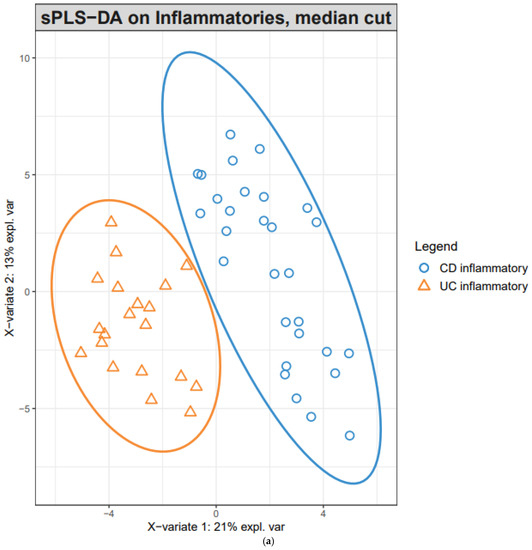 Howell et al. [10] elaborated on these findings. They obtained mucosal biopsies collected from children (median age, 13 years) newly diagnosed with IBD (43 with CD, 23 with UC) and 30 HC. They investigated gut-segment-specific differences and disease-specific alterations considering inflammation status in the transcription profiles of intestinal epithelial cells (IECs). In addition to a number of genes that were found to be differentially expressed between the IBD and control samples (e.g., DEFA5, DEFA6, LYZ, PLA2G2A, CD40, and CD44), ileal IECs revealed CD-specific changes in gene expression when compared with either controls or UC. However, the changes observed in the sigmoid colon reflected a “common IBD” signature, with a major overlap between the UC and CD signatures. To overcome this issue, we applied PLS-DA, a machine learning analysis to distinguish CD from UC.