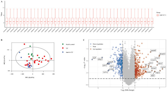 Identification of differentially expressed genes (DEGs) in the dataset GSE38713. (A) The extracted data in GSE38713 were normalised and processed by log2 transformation. (B) Principal component analysis (PCA) of dataset GSE38713. Three groups of samples (healthy control, green; UC, red; inactive UC, blue) are shown in the PCA plot. (C) The volcano plot of the GSE38713. The red data points represent the upregulated genes (log2FC >1, FDR <0.05) and the blue data points represent the downregulated genes (log2FC <−1, FDR <0.05).