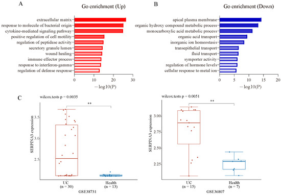 GO enrichment analysis and candidate gene validation. Gene ontology analysis of the up- (A) and downregulated (B) DEGs was conducted using Metasacape online tools (p < 0.01). (C) Validation of the candidate gene SERPINA3 in GSE38713 and GSE36807. ** p < 0.01.