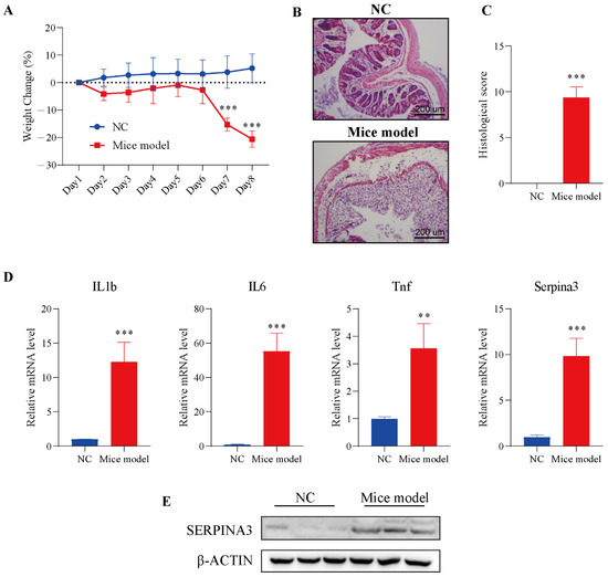 SERPINA3 was upregulated in the mouse colon after DSS treatment. Mice were divided into two groups: the control group (n = 5, NC) and the DSS treatment group (n = 8, mouse model). Mice received 2.5% DSS for 7 days. Throughout the DSS treatment period, daily body weight was recorded. At the end of the modelling day, the mice were sacrificed, and distal colon samples were used for paraffin sectioning and qRT-PCR detection. (A) Body weight change in mice during the experimental period. (B) HE staining of colon tissues from the control and DSS-induced colitis model mice. (C) Histological scores of colon tissues. (D) The mRNA levels of IL1b, IL6, Tnf, and SERPINA3. (E) SERPINA3 protein expression was detected by Western blot. ** p < 0.01, *** p < 0.001.