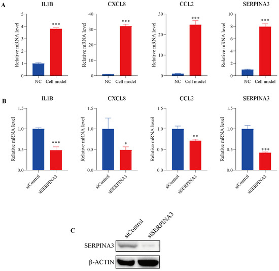 The potential role of SERPINA3 in an in-vitro UC model. HT29 intestinal epithelial cells were incubated with (cell model) or without (NC) TNFα (10 ng/mL) for 12 h to mimic inflammatory conditions in vitro. (A) After TNFα stimulation, cell RNA was isolated, and the transcription levels of IL1B, CXCL8, CCL2, and SERPINA3 were detected by qRT-PCR. HT29 intestinal epithelial cells were transfected with control siRNA (siControl) or SERPINA3 siRNA (siSERPINA3). Forty-eight hours post-transfection, all the groups were incubated with TNFα (10 ng/mL) for 12 h. After transfection and TNFα stimulation, cell RNA was isolated. (B) The transcription levels of IL1B, CXCL8, CCL2 and SERPINA3 were detected by RT-qPCR. (C) SERPINA3 protein expression was detected by Western blot. * p < 0.05, ** p < 0.01, *** p < 0.001.