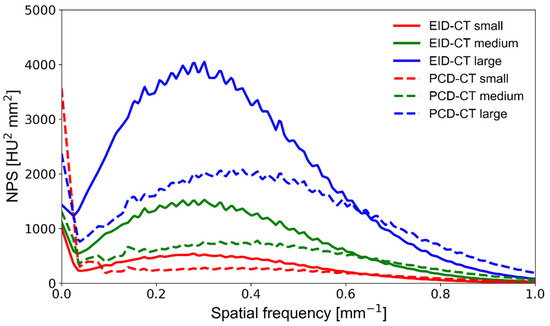 NPS curves obtained on a clinical EID-CT (solid lines) and a prototype PCD-CT (dashed lines) system at various phantom sizes. The area under the curve is representative of the noise magnitude, whereas the NPS center frequency indicates differences in noise texture. NPS—noise power spectrum; PCD-CT—photon-counting detector computed tomography; EID-CT—energy-integrating detector computed tomography.