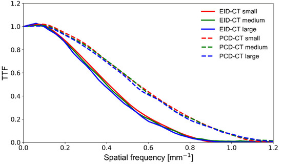TTF curves obtained on a clinical EID-CT (solid lines) and a prototype PCD-CT (dashed lines) system at various phantom sizes. The area under the curve indicates spatial resolution performance. TTF—target transfer function; PCD-CT—photon-counting detector computed tomography; EID-CT—energy-integrating detector computed tomography.