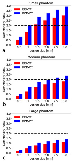 Bar chart show detectability indices (d’) of non-calcified atherosclerotic plaque with an object-to-background contrast |ΔHU| of 450 HU and CTDI = 10 mGy in the small (a), medium (b), and large sized (c) phantom setup. A d’ of 2 corresponds to 90% accuracy (AUC). The SPCCT consistently provided higher detectability indices than the conventional system. Note that at large phantom size, only the PCD-CT system could accurately detect (i.e., with a d’ ≥ 2 indicating an AUC of 90%) the smallest simulated plaque (0.5 mm). CTDI—computed tomography dose index; PCD-CT—photon-counting detector computed tomography. CTDI—computed tomography dose index; EID-CT—energy-integrating detector computed tomography; AUC—area under the curve.