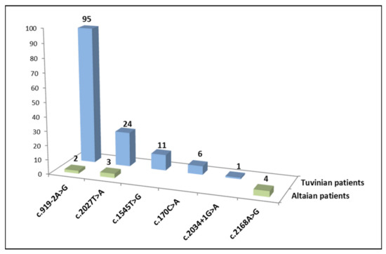 Variant c.919-2A>G was the most frequent of all pathogenic SLC26A4 variants detected in Tuvinian patients (95/137, 69.3%), followed by c.2027T>A (p.Leu676Gln) (24/137, 17.5%), c.1545T>G (p.Phe515Leu) (11/137, 8.0%), c.170C>A (p.Ser57Ter) (6/137, 4.4%), and c.2034+1G>A (1/137, 0.7%). Variant c.2168A>G (p.His723Arg) was prevalent in Altaian patients (4/9, 44.5%) followed by c.2027T>A (p.Leu676Gln) (3/9, 33.3%), and c.919-2A>G (2/9, 22.2%) (Figure 1).